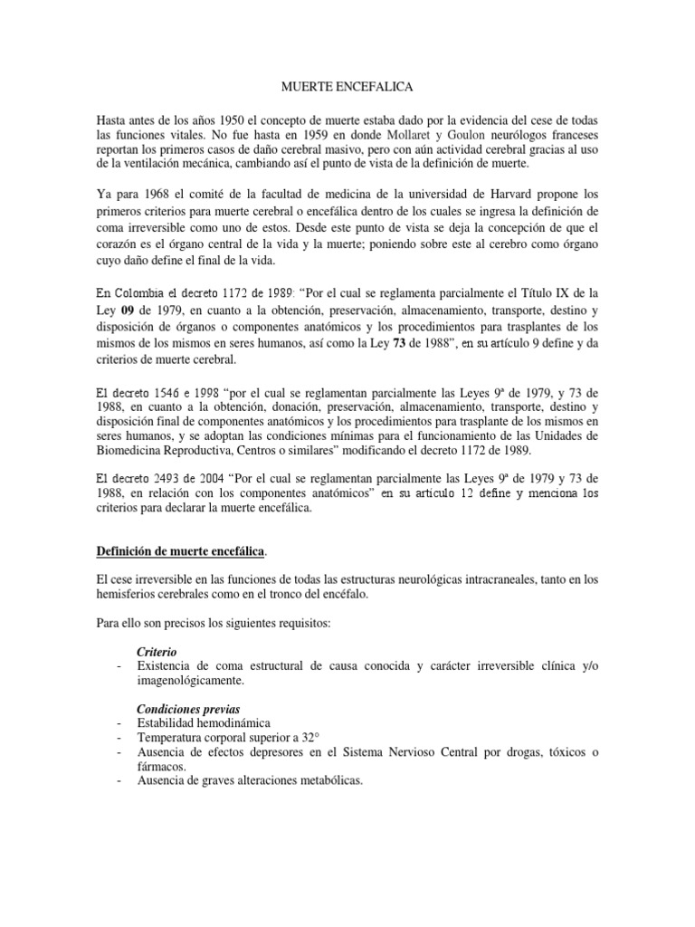 Muerte encefalica concepto muerte la pérdida total e irreversible de las funciones del encéfalo, ocasionado por un daño conocido, que determina el cese permanente del organismo como un todo muerte encefalica. Un hombre de 22 años que sufrió muerte encefálica debido a un accidente en motocicleta, se convirtió en donador multiorgánico, luego de que médicos especialistas de los centros médicos.